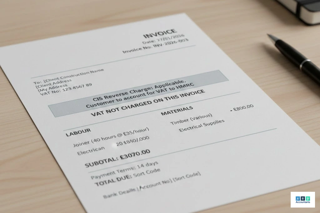 A CIS and VAT invoice must state that the CIS reverse charge applies, show VAT as not charged, and include mandatory wording.